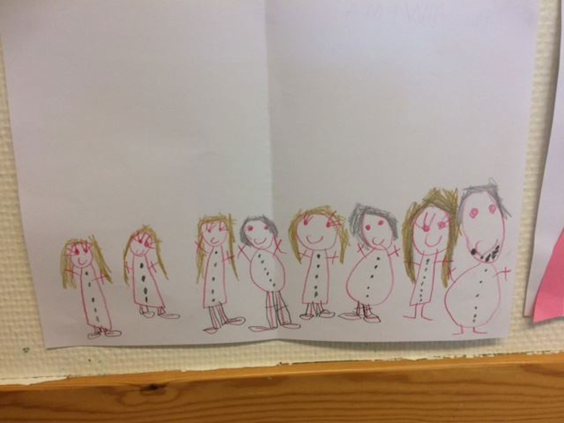 Denne flotte tegningen var verdt å dele med dere, mor og far og 6 barn. Ikke vet vi om det er et underliggende ønske om flere søsken, i så fall vil det være bra for rekrutteringen til barnehagen :)