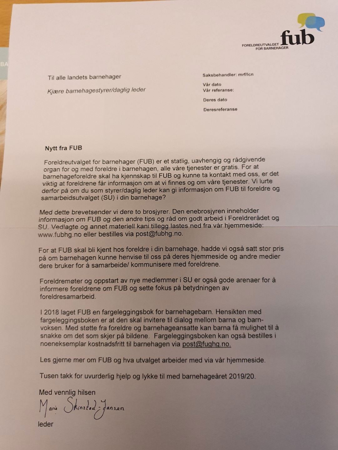 Foreldreutvalget for barnehager er et statlig, uavhengig og rådgivende organ for og med foreldre i barnehagen. Gå gjerne inn på hjemmesiden til FUB for mer informasjon: www.fubhg.no