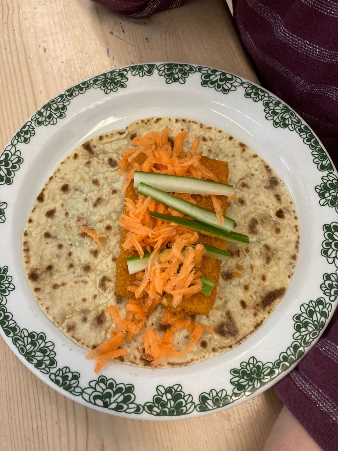 I dag ble første rett i ny meny testet ut; fiskepinner i lompe med revet gulrot, agurkstaver og remulade. Ungene spiste godt. Her er bilde fra et barn på 4 år som selv har forsynt seg:-)