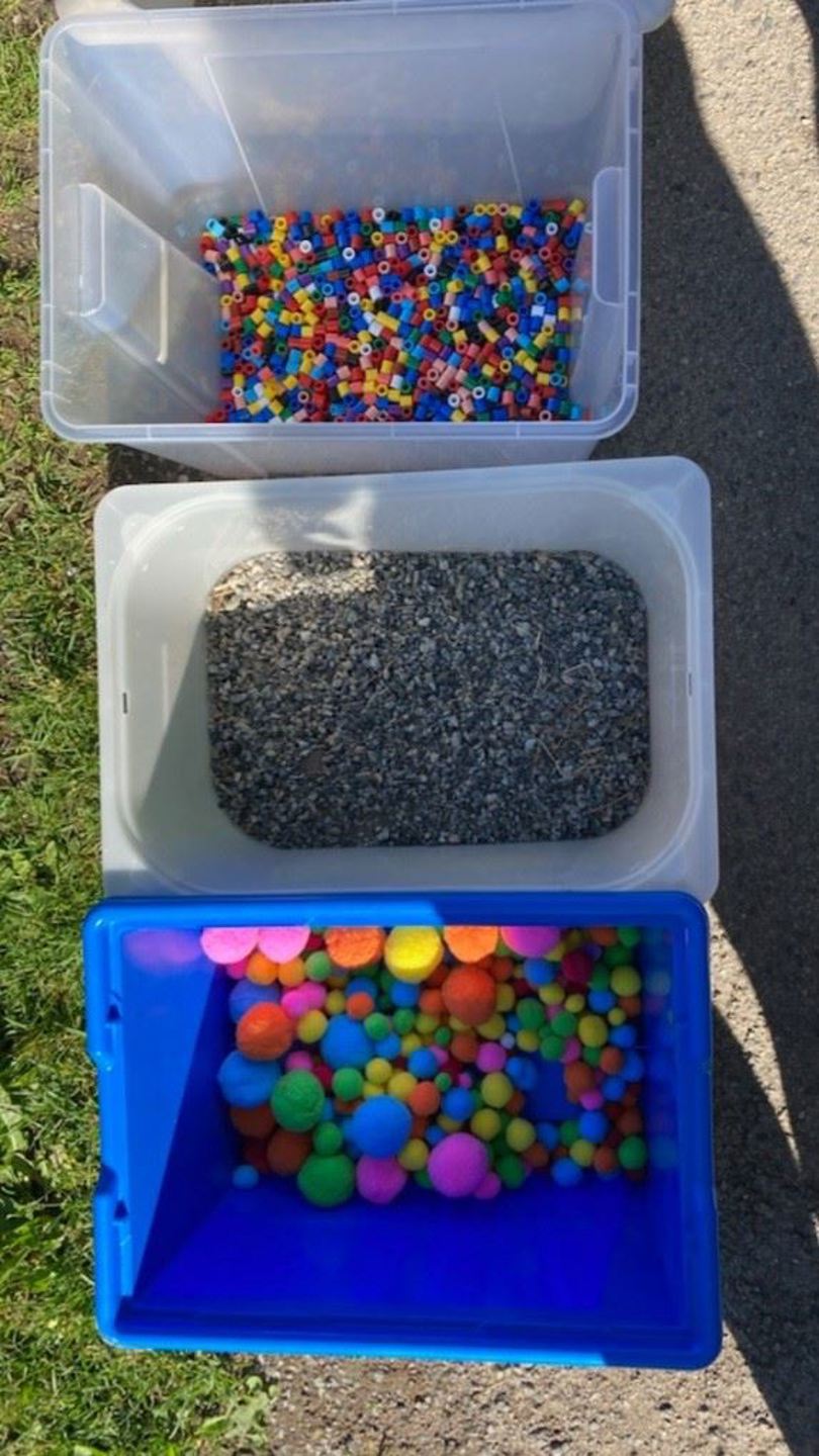 På småbarna har de ulike sansekasser ute, som barna kan leke med. Det er tøyballer, steiner/ grus, store perler, sand, blader og vann. Stor stas for barna!