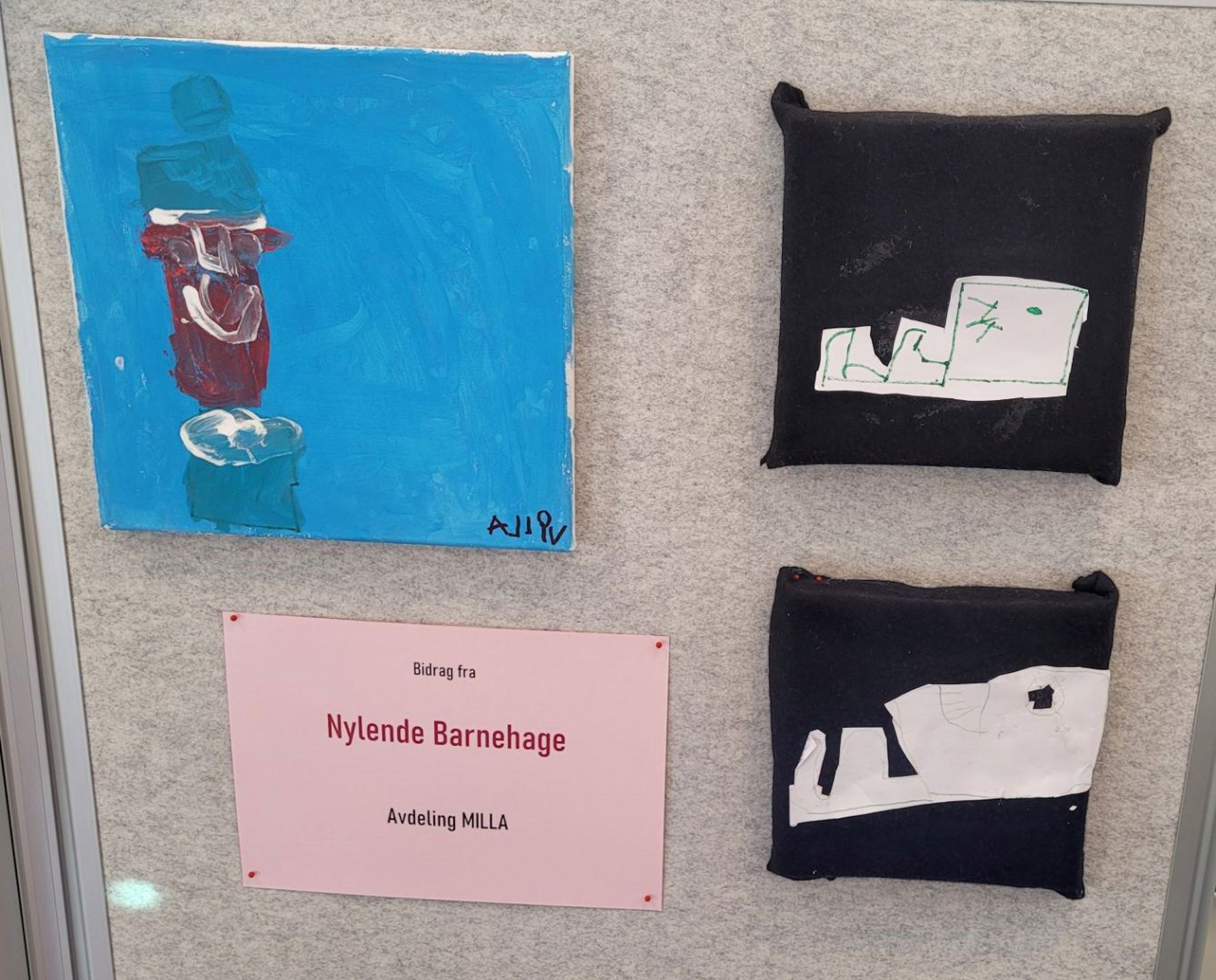 Barnehagen deltok i et kunstprosjekt i regi av Enebakk bibliotek i våres, og kunsten har hengt på biblioteket en god stund. Nå skal den sendes videre til Vinjesenteret til felles utstilling til høsten, det synes vi er moro:-)