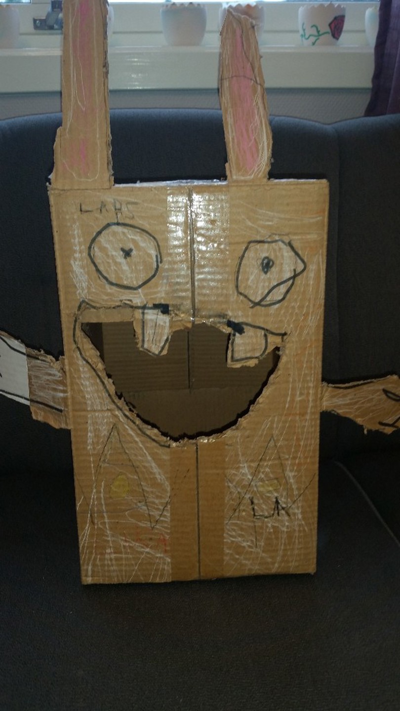 Intervju med 2 gutter på 5 år: "Først fant vi en pappeske, og så begynte vi å kutte. Så farga vi øra. Vi måtte teipe skikkelig så den ikke datt fra hverandre. Og så klippet vi og skrev navn. Den kan ikke ha bart, da er den gammel. Det skulle bli påskeharen. Det var en stor jobb! Den kan brukes som postkasse, men da må vi klemme inn øra og armene". God påske til dere alle!